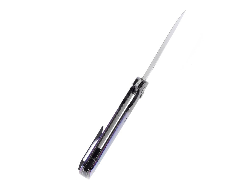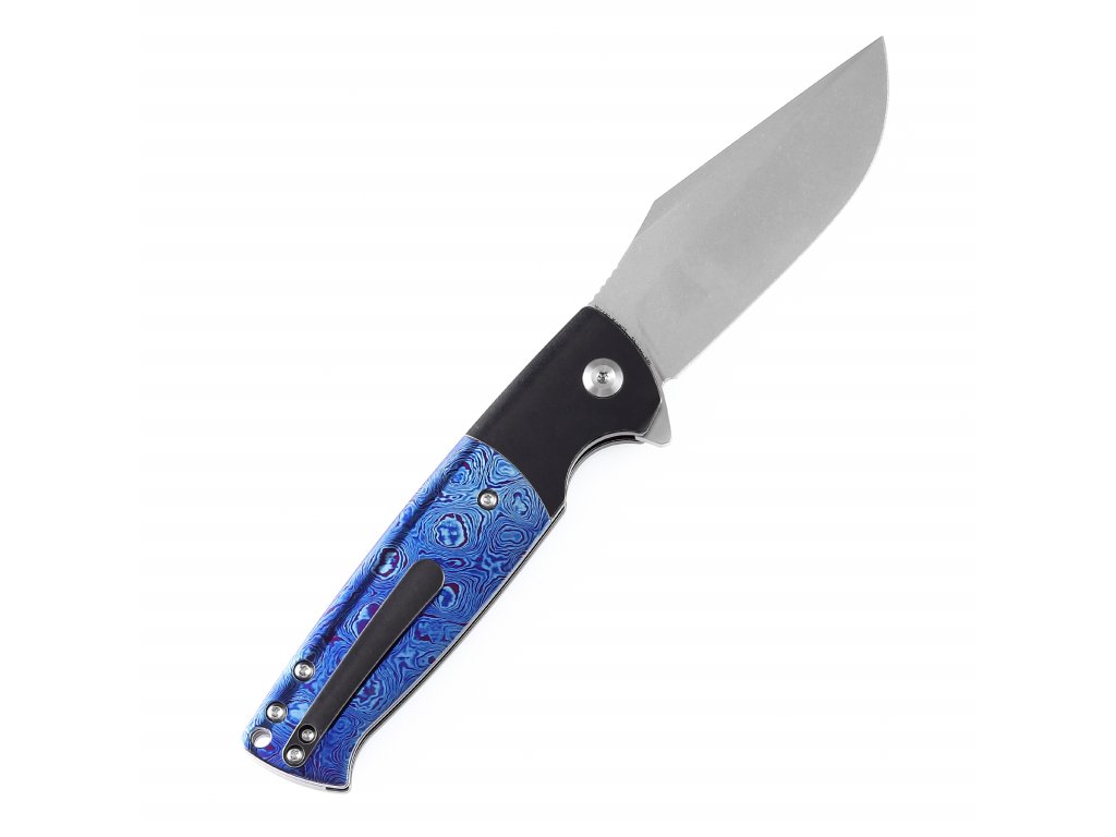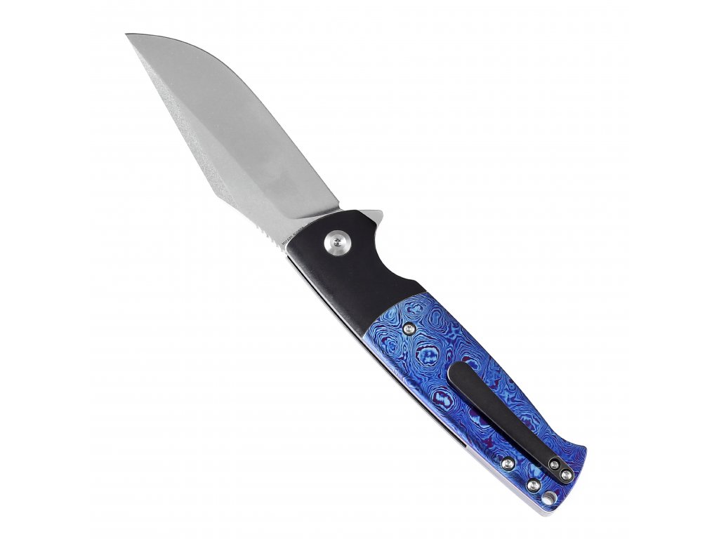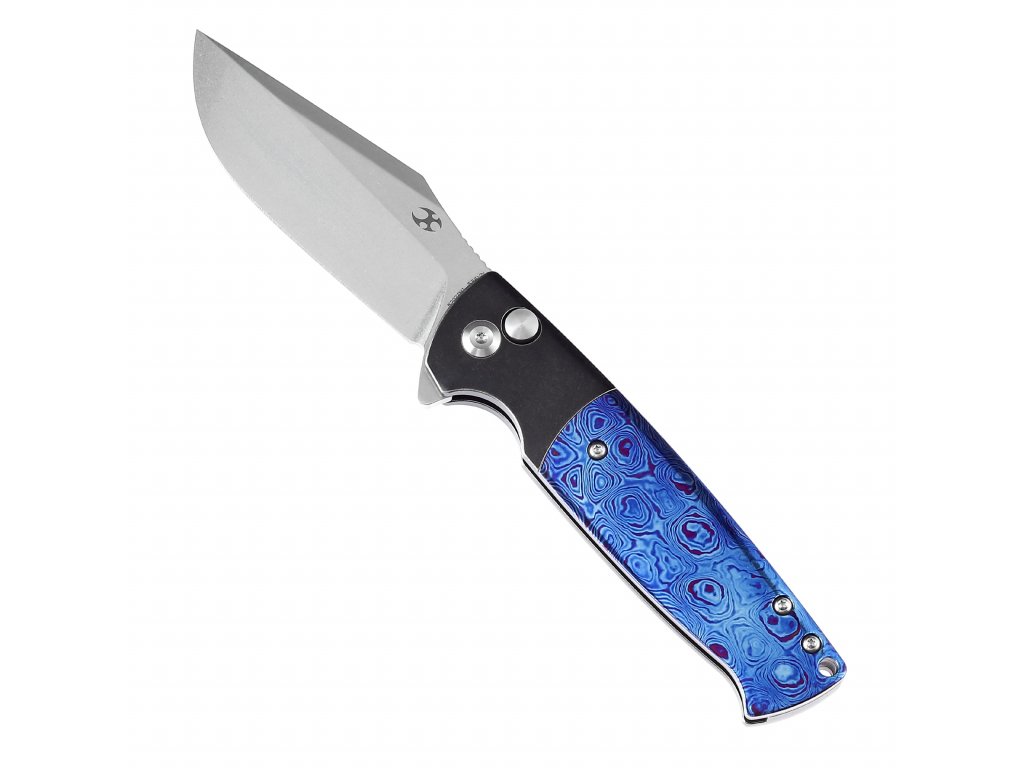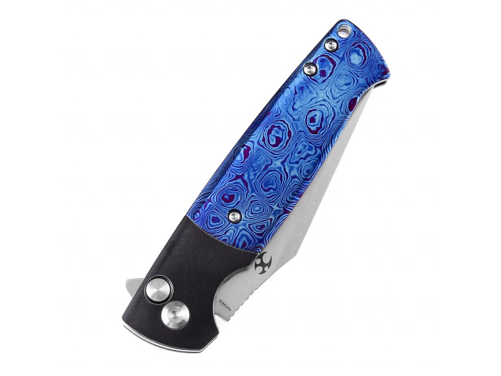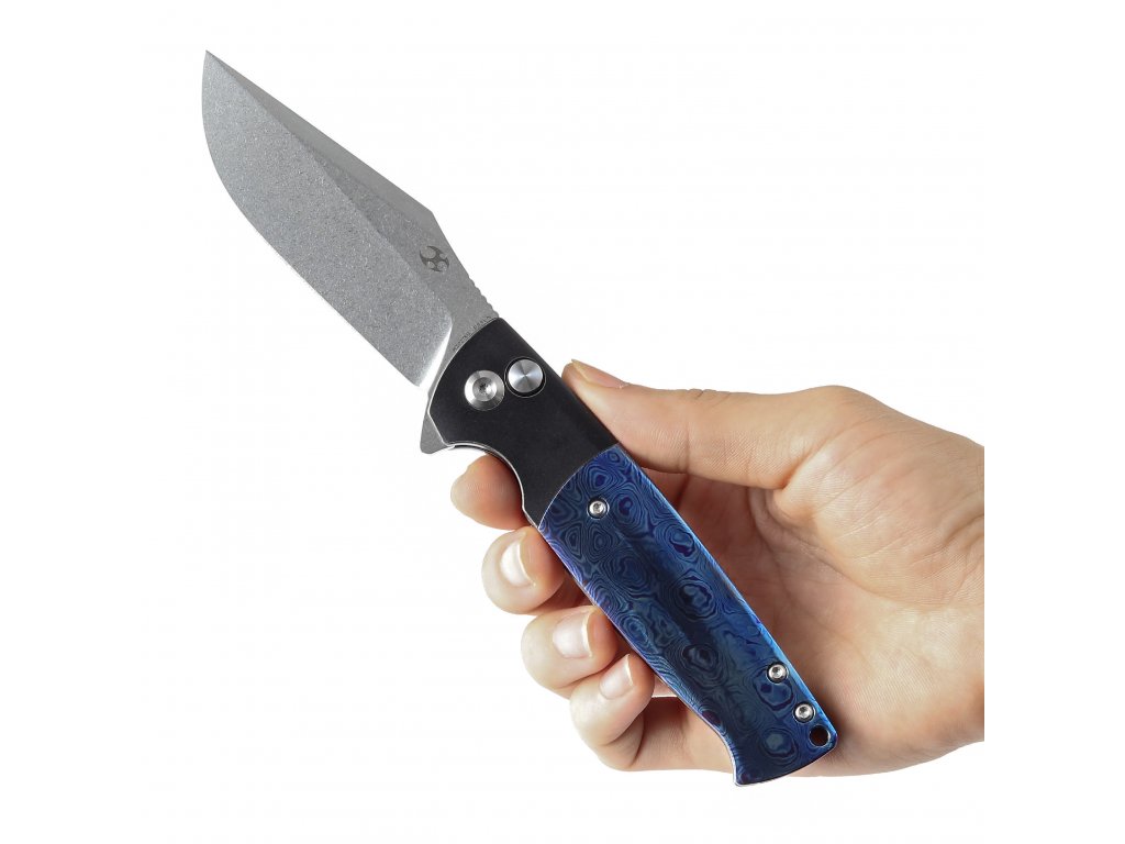 Kansept Shikari Button Lock Timascus Handle, Stonewashed CPM S35VN, Morgan Koens Design, K2027M1