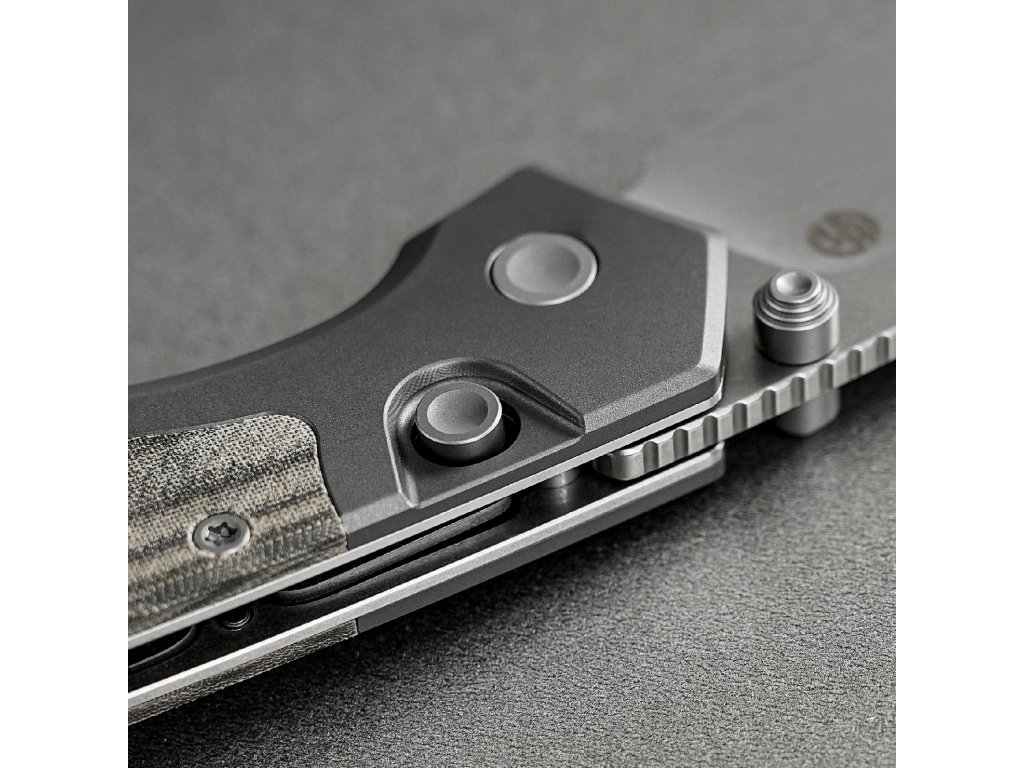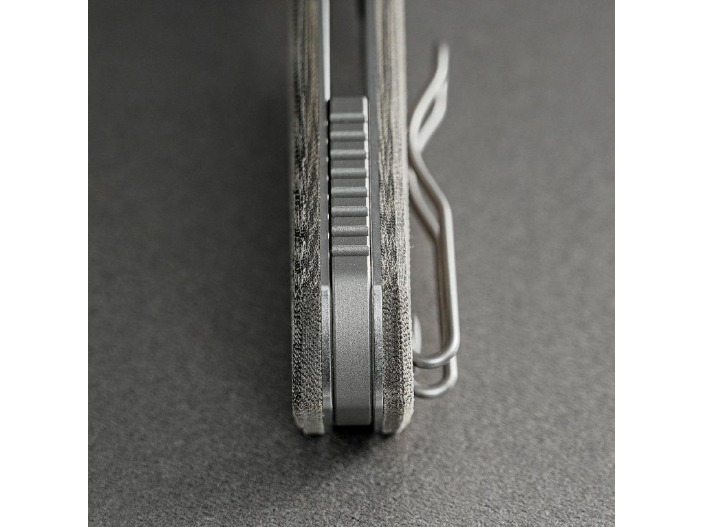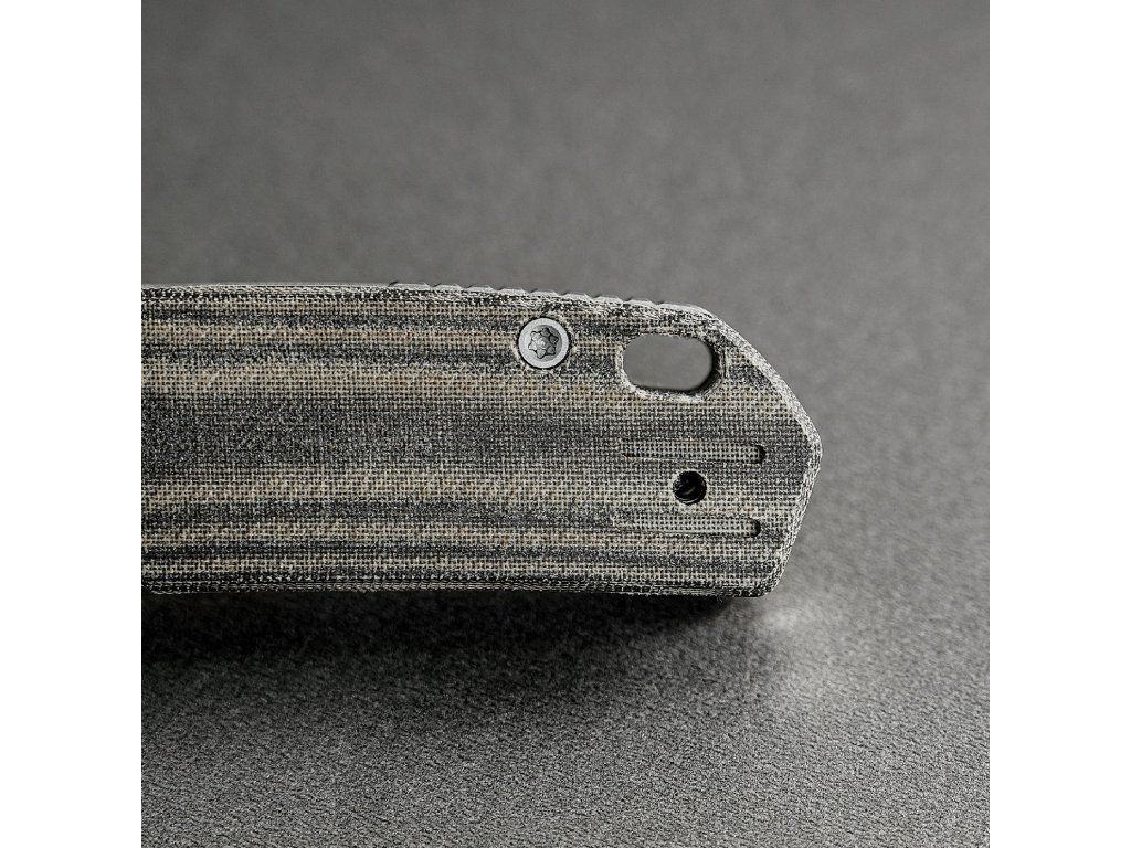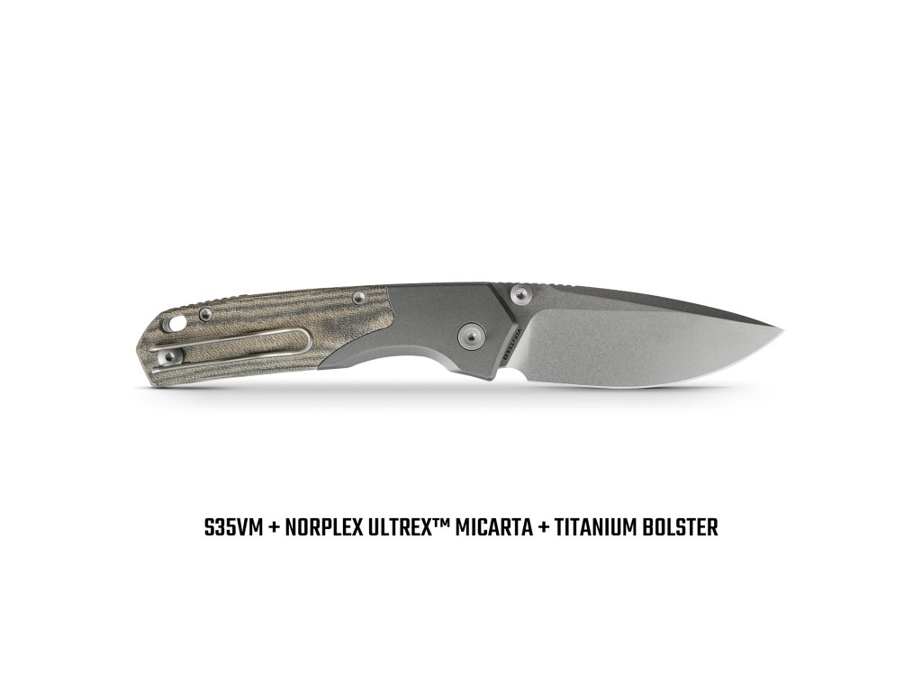 Rukojeť je záměrně navržena tak, aby spojovala vintage charakter s moderním minimalismem a je vyrobena z amerických šupinek Norplex UltreX™ Micarta a spárována s asymetrickými titanovými nebo mosaznými bouldery.