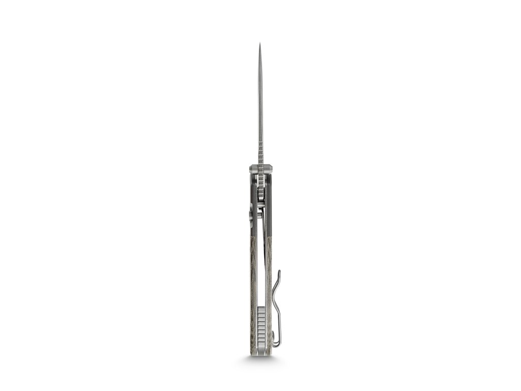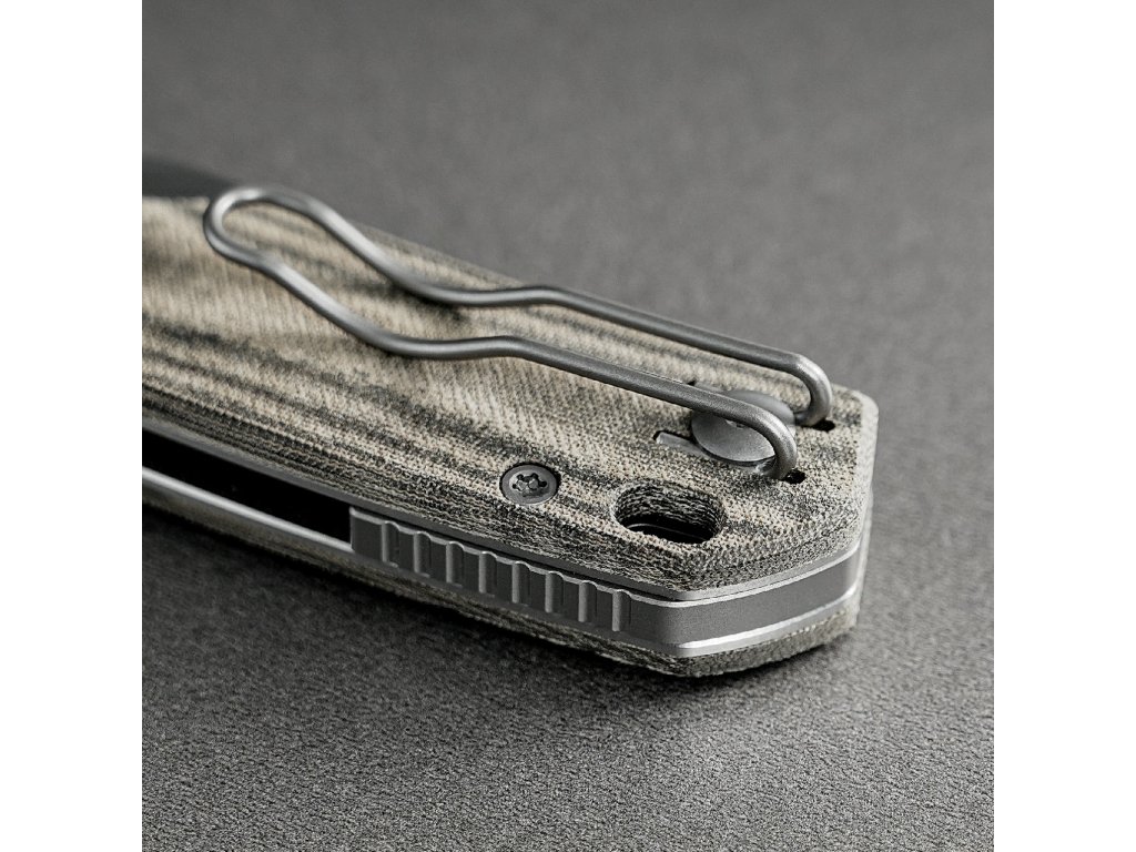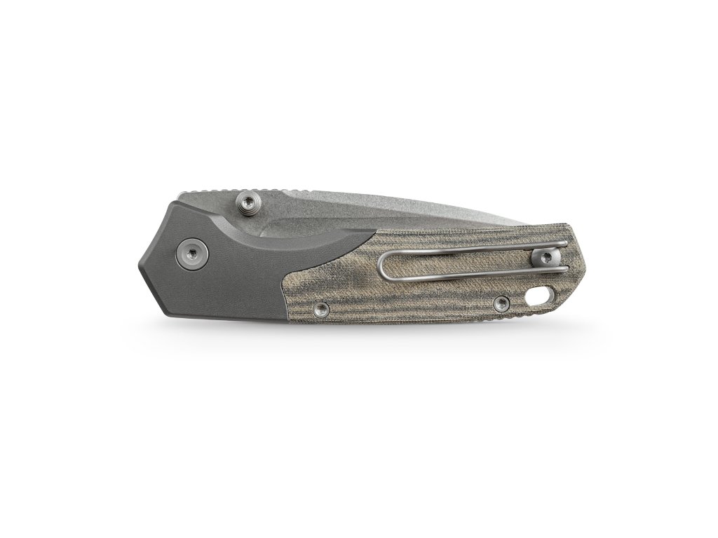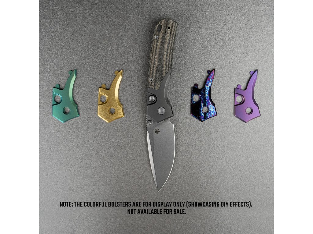 Rukojeť je záměrně navržena tak, aby spojovala vintage charakter s moderním minimalismem a je vyrobena z amerických šupinek Norplex UltreX™ Micarta a spárována s asymetrickými titanovými nebo mosaznými bouldery.