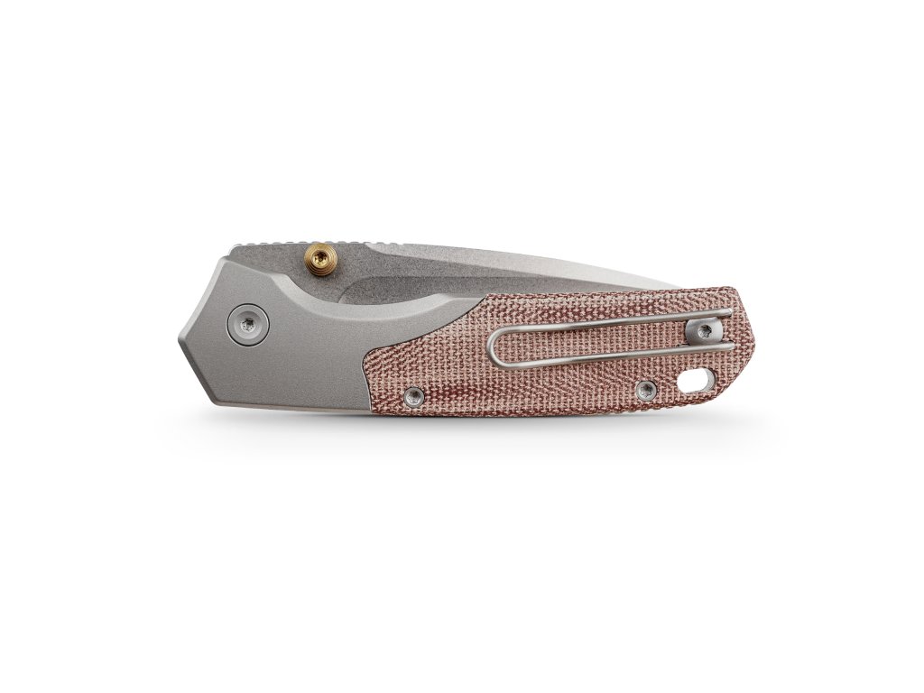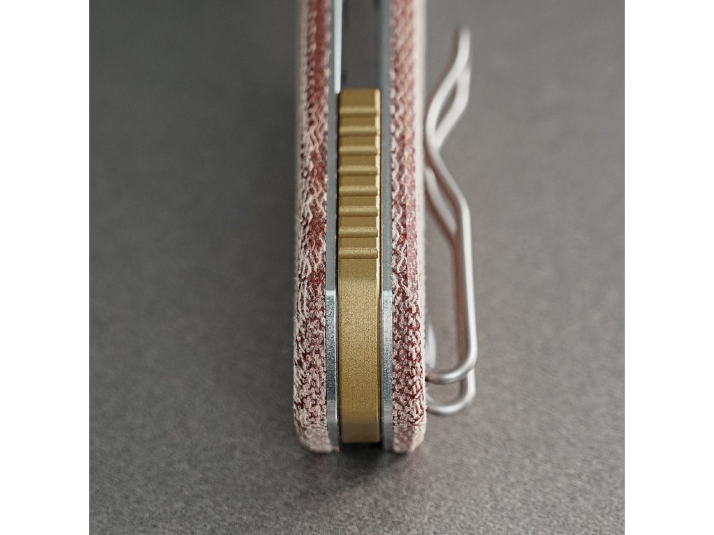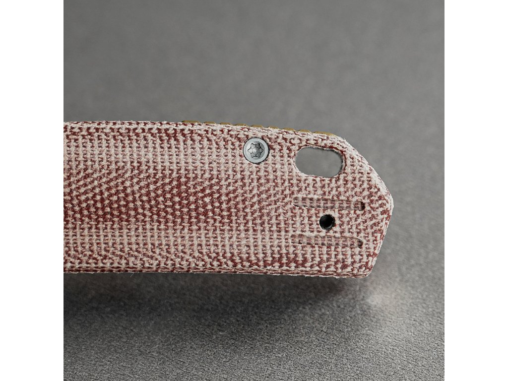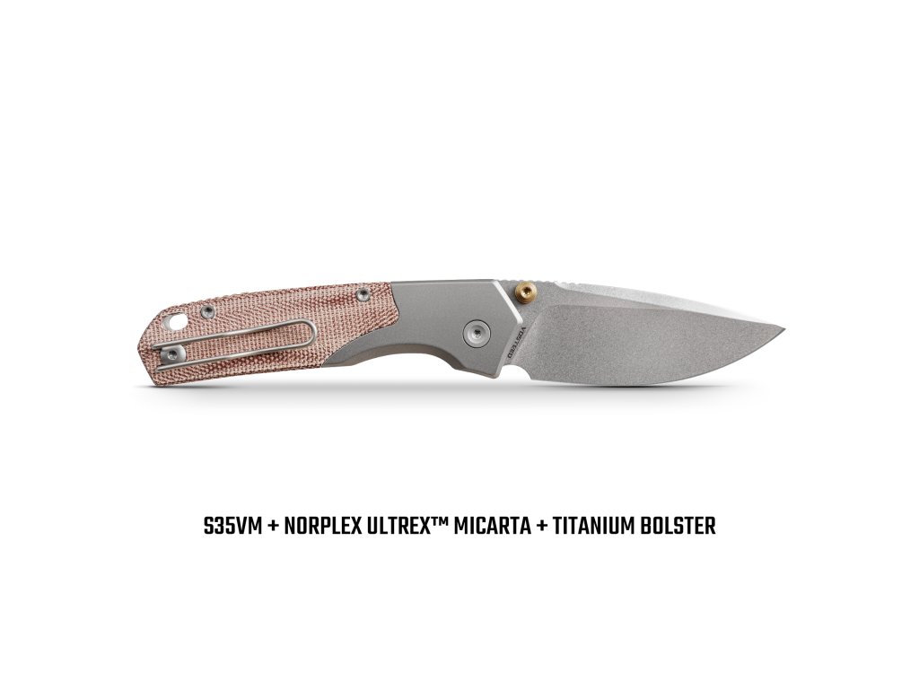 Rukojeť je záměrně navržena tak, aby spojovala vintage charakter s moderním minimalismem a je vyrobena z amerických šupinek Norplex UltreX™ Micarta a spárována s asymetrickými titanovými nebo mosaznými bouldery.
